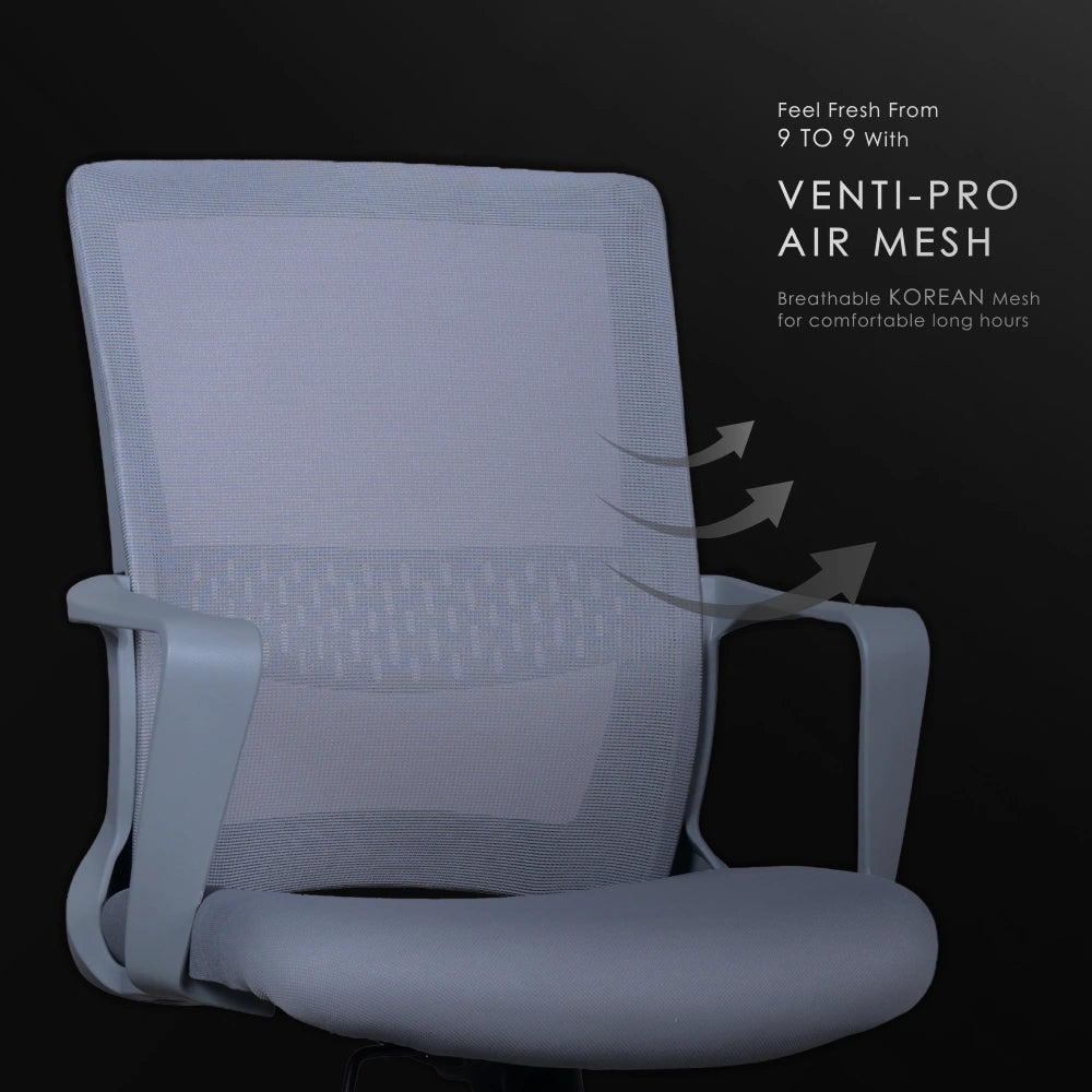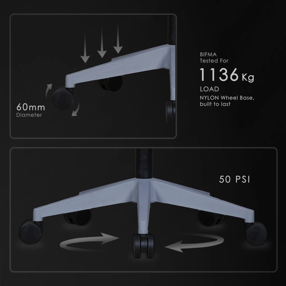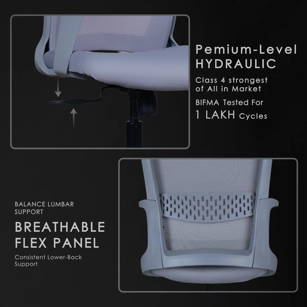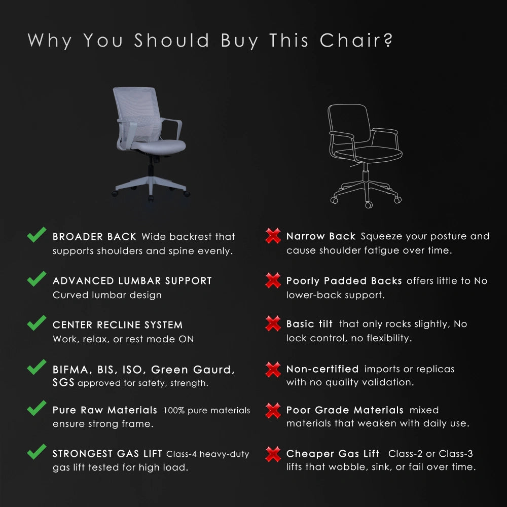 Neer is a high-performance workstation chair engineered for long-hour comfort with dynamic lumbar flex support, a broader breathable mesh backrest, smart center-tilt locking system, and a 135° controlled recline for work-to-relax transitions. Built with Venti-Pro Korean air mesh, a heavy-duty Class-4 hydraulic gas lift tested for 1 lakh cycles, a BIFMA-tested reinforced base, and silent 60mm casters, Neer delivers reliable stability, cooling airflow, and everyday durability. Fully certified by BIFMA, BIS, ISO, UL Green Guard, and SGS, the Neer Workstation Chair ensures dependable ergonomics and long-lasting performance for modern workspaces.